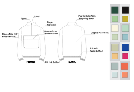 This was an Illustrator flat sketch I built upon. It's a pair of pants and a half zipper jacket. The designs and cutouts within the pattern elevate the designs from simple to more complex and gives it a unique organic feel, While the color schemes explored giving the pants and jacket a different feeling or aesthetic through only altering the color scheme.